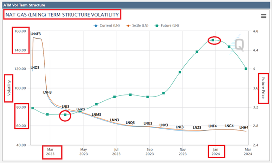 天然氣期權交易有下面兩個特點:第一冬季月份的天然氣期權隱含波動率要比其他季節高得多,請看下面圖5中綠線。