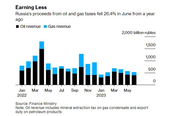 由于原油價格下跌和歐洲天然氣供應受限,俄羅斯上月油氣收入縮水逾四分之一。俄羅斯財政部表示,6月來自石油和天然氣稅的預算收入同比下降26%,至約5290億盧布(合58.4億美元)。其中,天然氣稅的預算收入下降了54%,至1257億盧布,而原油和石油產品的收入(占碳氫化合物收入的76%以上)下降了近十分之一,至4028億盧布。